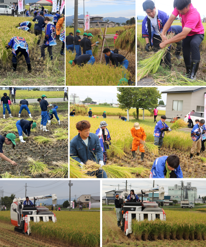 京急グループ社員をはじめ、秋田県立大曲農業高校生、圃場をお借りしている農事組合法人北川目ファーム、JA秋田おばこ、JA全農あきたの職員など約50人が参加し、5月に田植えした「あきたこまち」を手刈りしたほか、コンバインでの刈り取りにも挑戦しました。