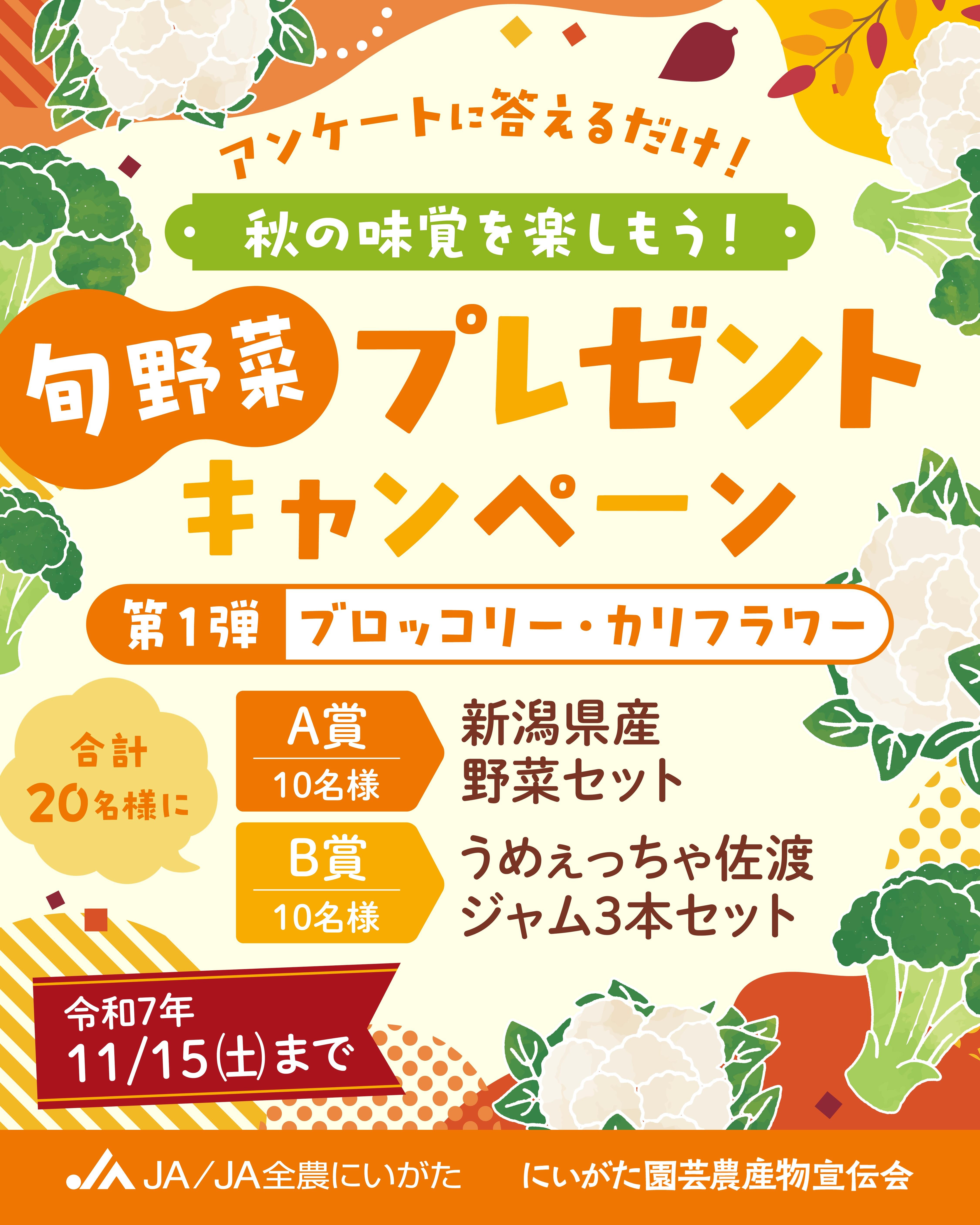 にいがた園芸農産物宣伝会では、10月6日(月)~11月15日(土)まで「秋の味覚を楽しもう!旬野菜プレゼントキャンペーン~第1弾ブロッコリー・カリフラワー~」を実施します!