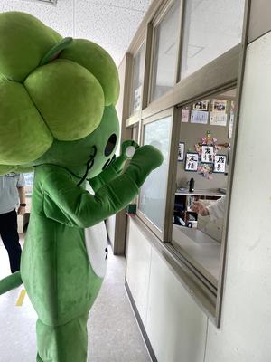 授業後の給食では全校生徒を対象にアレキを提供。アレキにより親しみを持ってもらえるよう、JA全農おかやまのマスコットキャラクター「マスキャット」が、校内テレビ放送に登場し、同小学校の校長先生と一緒にアレキの魅力を伝えました。