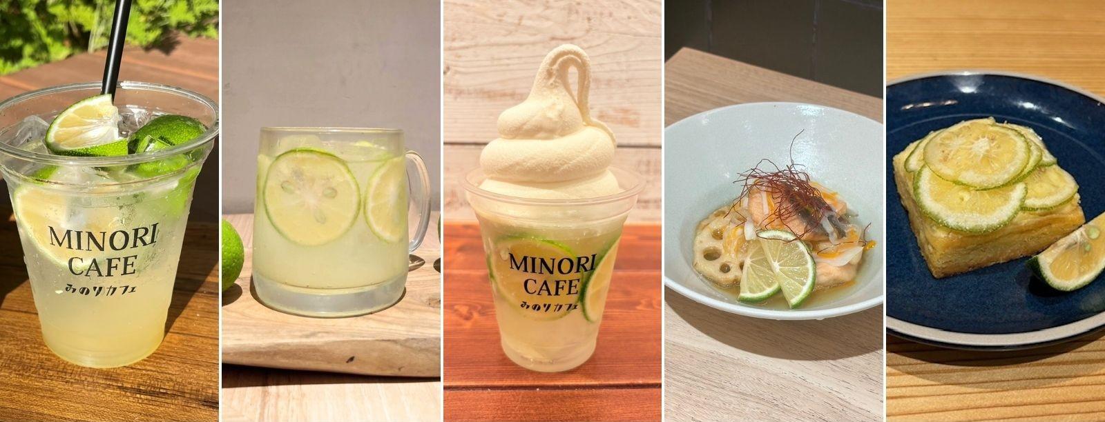 かぼすスカッシュ700円(みのりカフェ銀座店)、かぼすスカッシュ550円(みのるダイニング岡山店)、かぼすスカッシュフロート759円(みのりカフェ福岡パルコ店)、秋鮭と糸島野菜のかぼす南蛮漬け定食1,529円(みのりカフェ博多店)、かぼすのスクエアタルト649円(みのりみのる大分店)