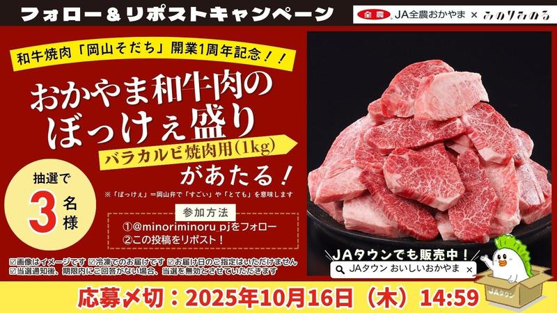・商品内容:「おかやま和牛肉のぼっけぇ盛り バラカルビ焼肉用(1kg)」3名様にプレゼント