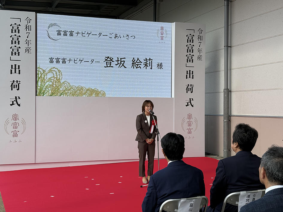 続いて、新田八朗富山県知事より「生産者の皆さんの適切な栽培管理により、今年も自信を持っておすすめできる高品質な米に仕上げていただき、感謝申しあげます。」とご祝辞をいただいた後、本年度より富富富ナビゲーターに就任された登坂 絵莉さんから「富富富は暑さに負けず強く逞しく育つ、未来に繋がる米だと思っています。富富富の魅力をたくさんの方に伝えていきたいです。」と富富富ナビゲーターとしての抱負を話されました。