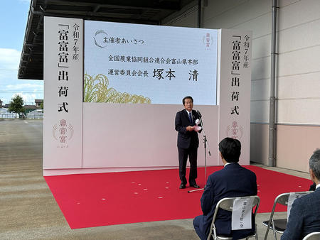 開式にあたり、JA全農とやま 塚本運営委員会会長より「令和7年産 富富富の作付面積は昨年と比較し450ha増加した。6月以降の高温や少雨が続く非常に厳しい栽培条件ではあったが、高温に強い特性を発揮し、高品質な米に仕上がっている。また、今年からキャッチコピーが一新され、「笑顔ひろがる、毎日『ふふふ』。」となった。今後、さらなるPR活動をすすめることで、富富富を食べるたびに、思わず笑顔で「ふふふ」と口元がほころぶ幸せな時間を、より多くの消費者にお届けできるよう、新しいキャッチコピーを使って販路拡大につとめたい。」と挨拶がありました。