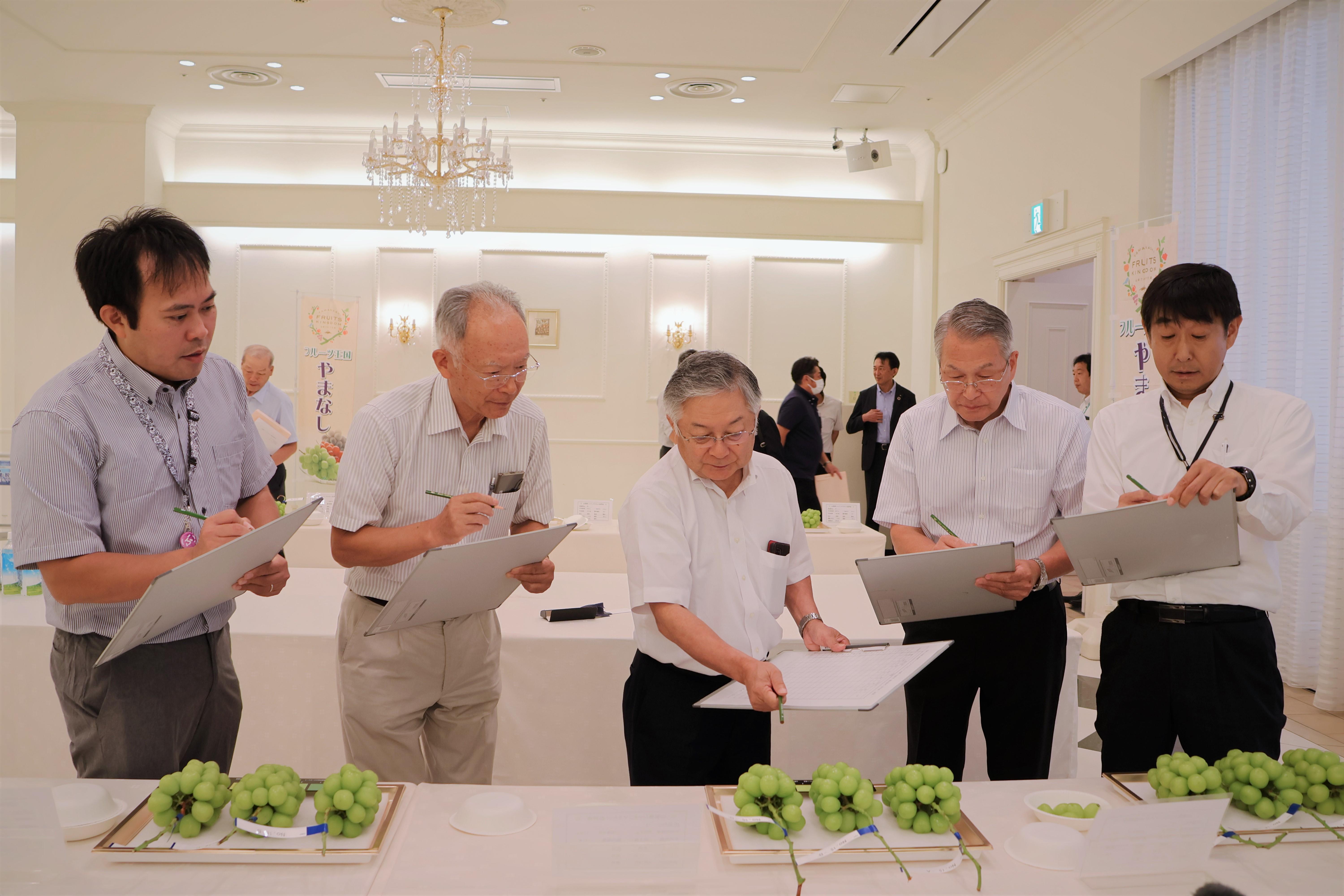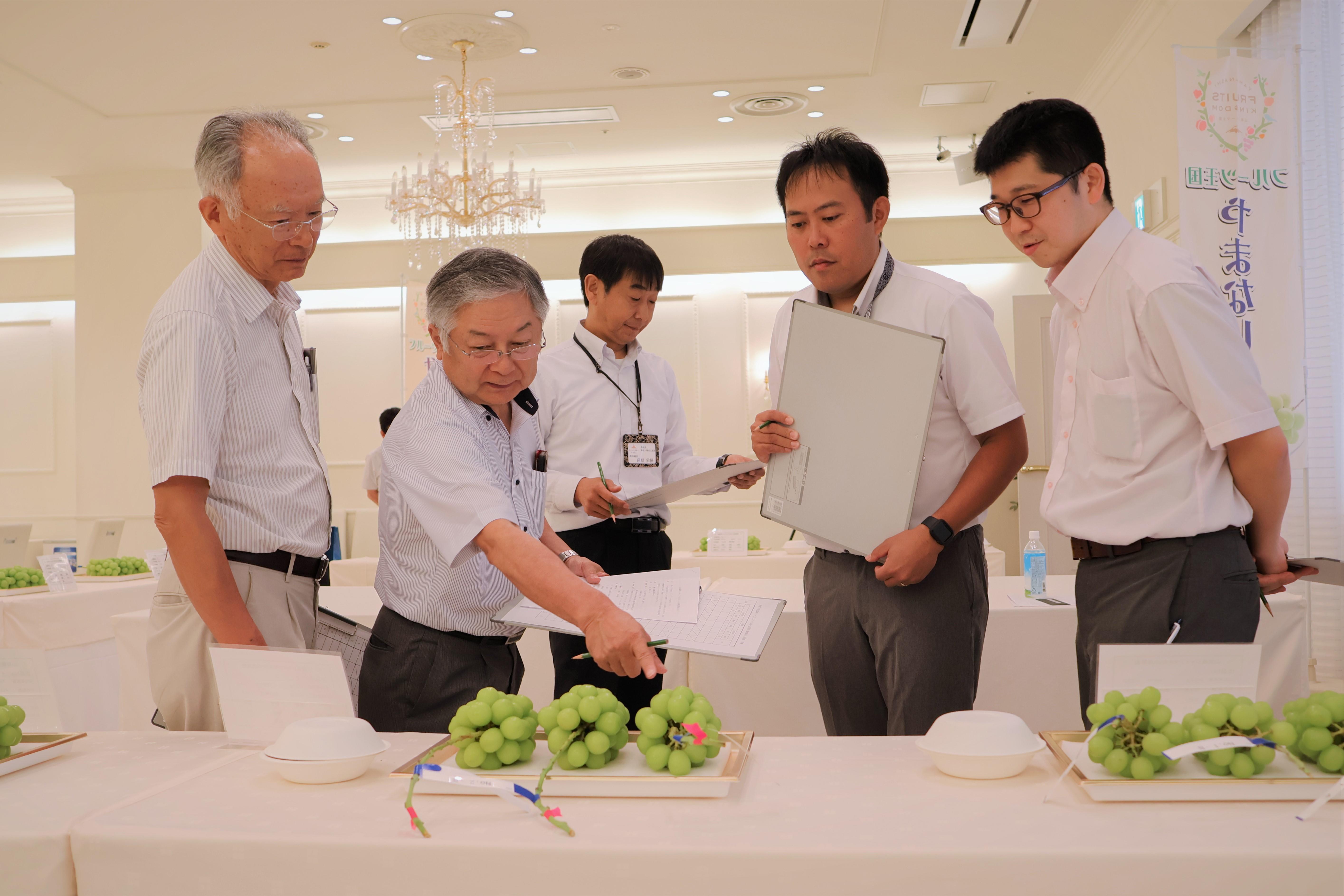 山梨県本部は甲府市のベルクラシック甲府で8月28日に早場、9月18日に遅場の「山梨県シャインマスカット品評会」を開きました。