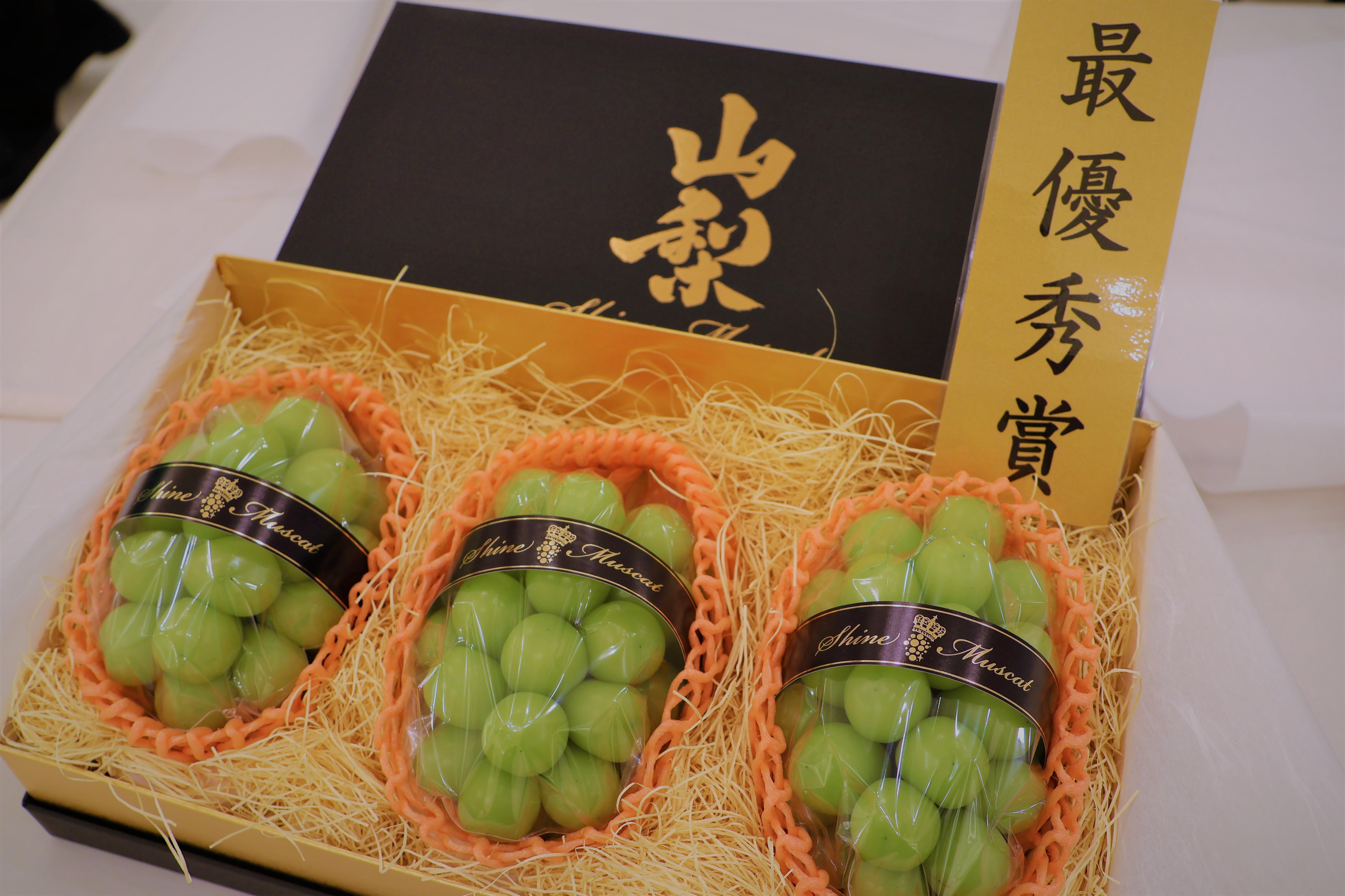 早場の部では、品評会翌日、東京都中央卸売市場大田市場の東京青果(株)でセリにかけられ、最優秀賞のシャインマスカット3房入り化粧箱は30万円の値が付きました。遅場の部では、品評会翌日、大阪市中央卸売市場本場の大阪中央青果(株)でセリにかけられ、最優秀賞のシャインマスカット3房入り化粧箱は30万円の値が付きました。
